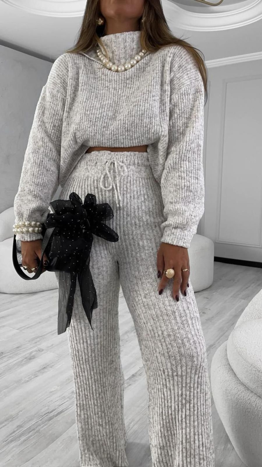 O conjunto ideal para quem ama estilo com conforto absoluto. Feito em tricô canelado super macio e com brilho sutil, ele traz uma blusa ampla com gola alta estruturada e uma calça de caimento fluido com amarração na cintura. O visual é moderno, elegante e aconchegante — perfeito para dias mais frescos, viagens ou produções casuais sofisticadas. Um look que abraça o corpo na medida certa e entrega presença sem esforço.