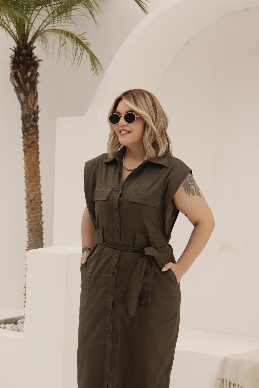 O vestido aurora é a tradução do poder feminino com elegância. Com design utilitário chic e modelagem que valoriza o corpo, ele une sofisticação, conforto e versatilidade em uma única peça. Confeccionado em tecido leve e estruturado na medida certa, possui abotoamento frontal, cintura ajustável com faixa que define a silhueta e comprimento mídi, trazendo equilíbrio perfeito entre moderno e refinado. As ombreiras sutis adicionam imponência ao visual, criando um look marcante e elegante.